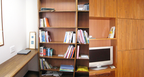 書斎には、収納力抜群の本棚と