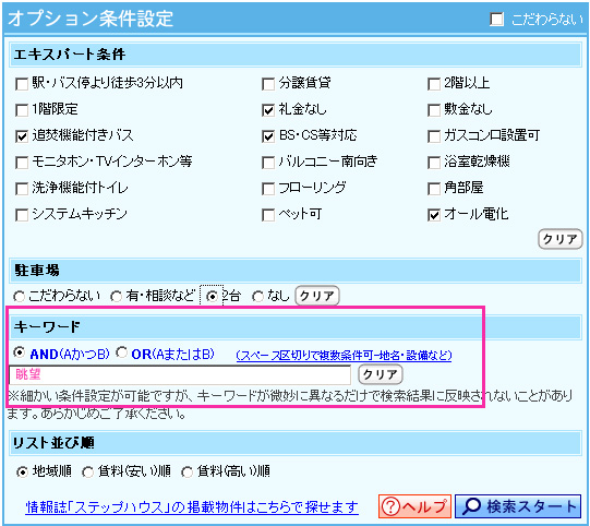 ステップハウスのお部屋を探すからオプション設定の中にある。